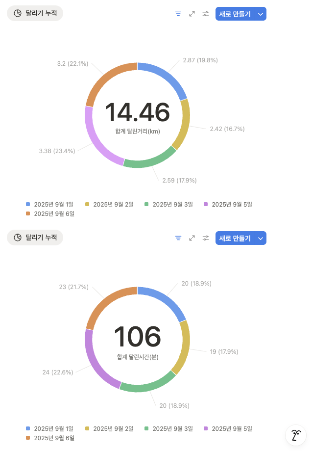 p.s 달리기 기록을 노션에 정리해 두고 있는데 차트 기능을 활용해 누적 거리와 시간을 시각화하기 더욱 뿜뿜!