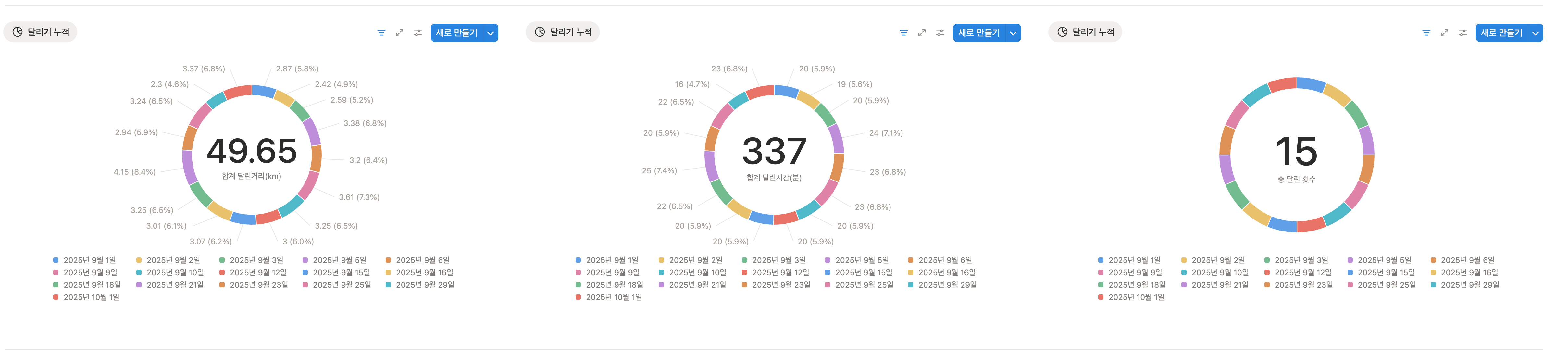 5월에 첫째 학교 체육대회 가서 계주 뛰다가 승부욕 발동해서 햄스트링 부상 후에 꽤 오래 동안 달리기를 쉬었어요. 더이상 미루면 안될것 같아서 <한 달 누적거리 마라톤 챌린지>에 참여해서 9월 부터 달리기 시작. 생각보다 더 많이 뛸 수 있었던 기분 좋은 기억. 총 15회를 달렸고, 337분동안 49.65km를 달렸습니다. (목표였던 42.195km 돌파!) 예전에는 한번 뛰면 그래도 최소 5킬로 이상은 뛰려고 했었는데, 거리수 보다는 딱 5분 걷고 5분만 뛰고 오자는 생각으로 임했던 게 나름의 성공 포인트!