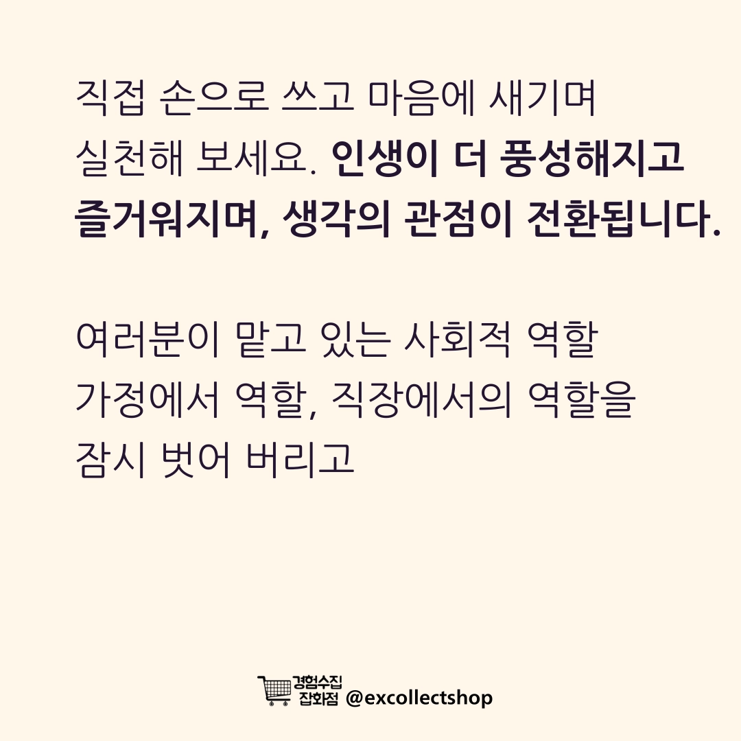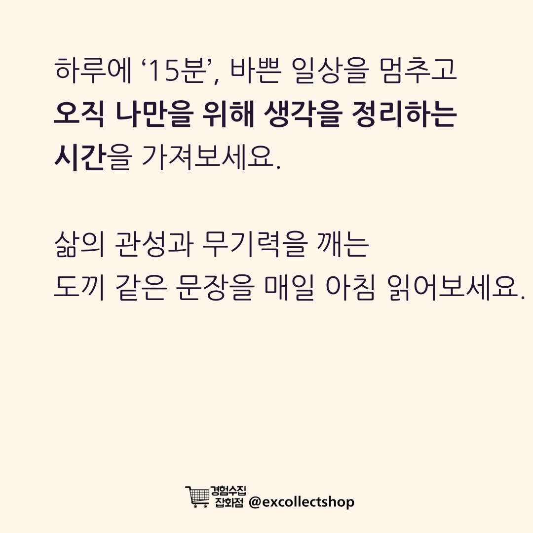 하루에 15분 바쁜 일상을 멈추고, 오직 나만을 위해 생각을 정리하는 시간을 가져보세요. 삶의 관성과 무기력을 깨는 도끼 같은 문장을 매일 아침 전달드립니다. 직접 손으로 쓰고 마음에 새기며 실천해 보세요. 인생이 더 풍성해지고 즐거워지며, 생각의 관점이 전환됩니다.