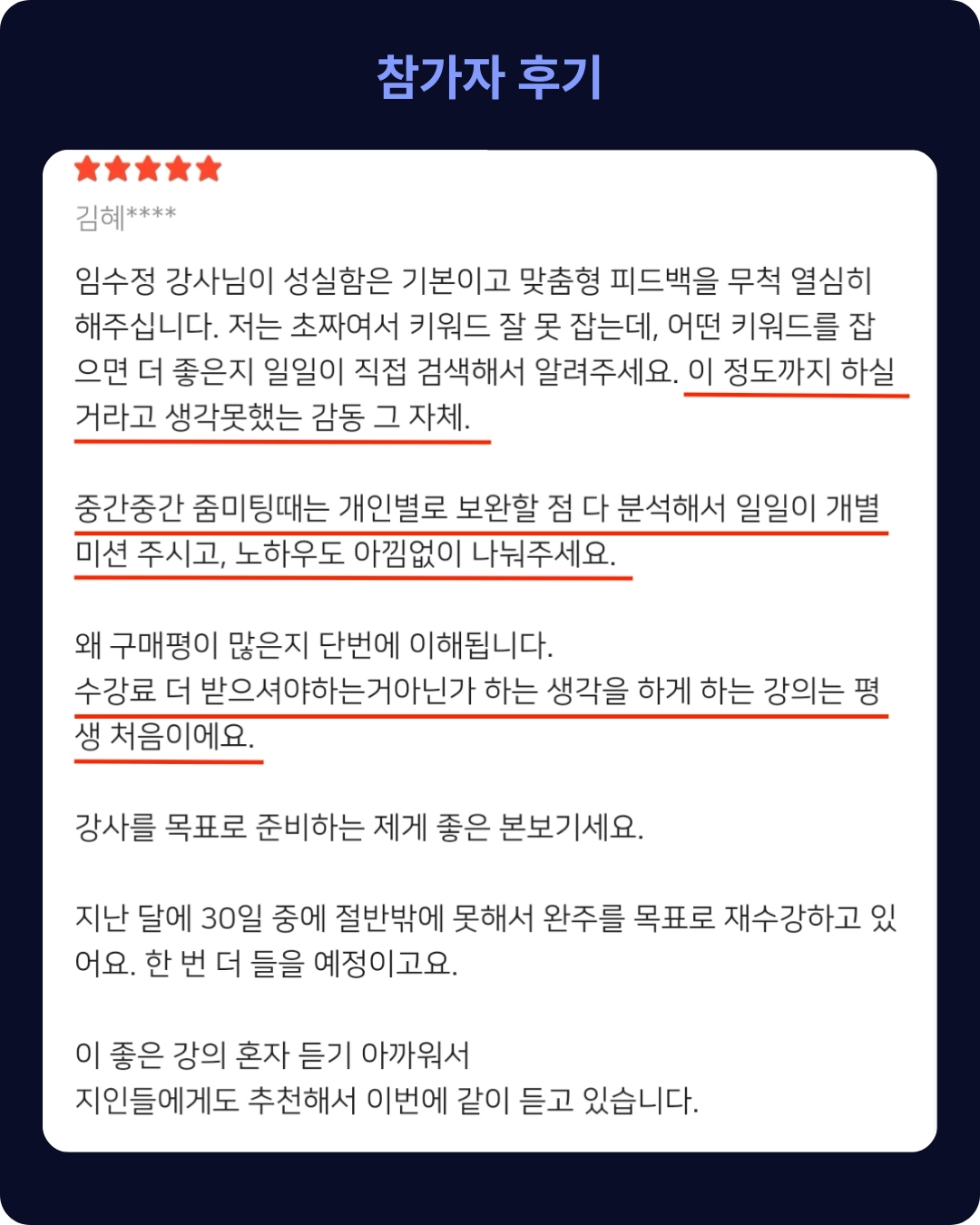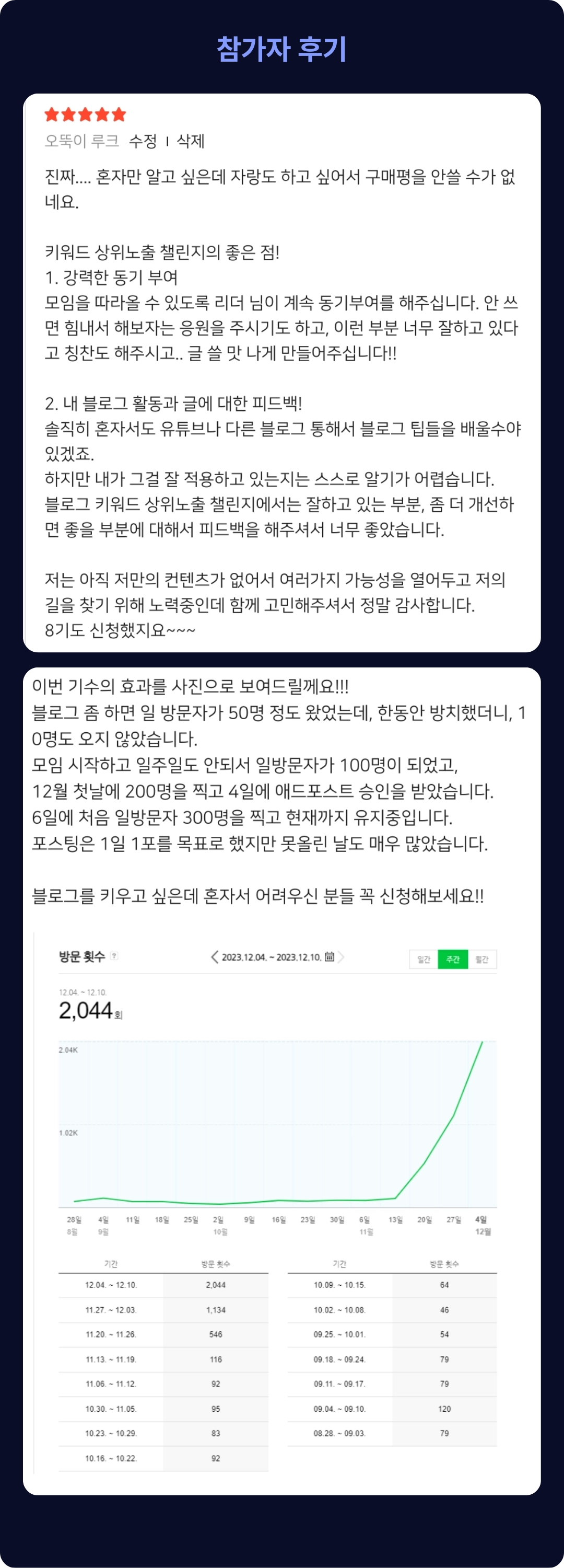 경험수집잡화점 전체 상품 중 구매평이 가장 많은 상품으로 참가자분들이 성과를 내며 만족도가 높은 챌린지입니다. 그리고 모임을 이끌어 가시는 파트너님의 개인적 사정으로 이번 기수를 끝으로 다음 기수는 내년 3월 이후에 진행하게 됐습니다. 블로그 상위노출을 배우고 직접 실습해보며 맞춤 피드백을 받고 싶은 분들은 이번 기수를 참여해보세요 (현재 1자리 남았습니다)