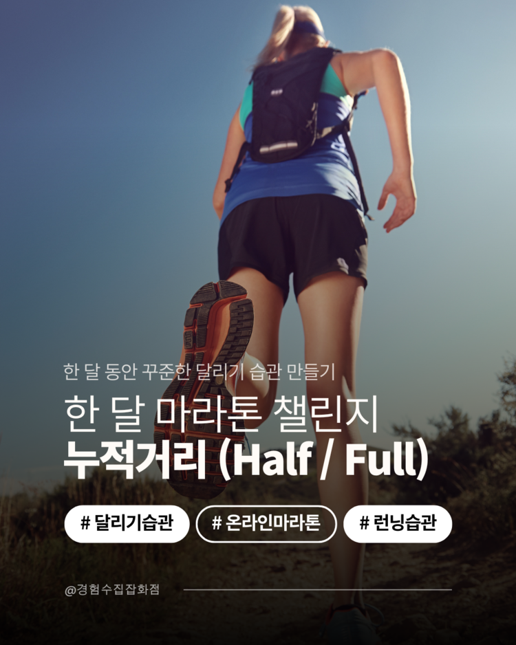 "마라톤 풀코스, 한 번쯤 완주해보고 싶지 않나요?" 하지만 42.195km라는 거리가 부담스럽다면, 한 달 동안 누적 거리로 완주하는 마라톤 챌린지에 도전해보세요! 매일 조금씩 달리고, 함께 응원하며 목표를 달성하는 경험을 만들어갑니다. 저도 이 챌린지를 참여하면서 누적거리 42.195km를 달성하고 있습니다! (달리기가 시작이시라면 하프 마라톤(21km)을 목표로 참가하셔도 좋습니다.)
