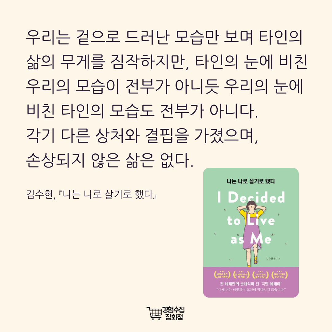 살다 보니 일상과 현업에 매몰되어 매너리즘에 빠지지 않으셨나요? 비슷한 사람만 만나고 좋아하는 콘텐츠만 보며 자신의 생각의 틀이 고정되지 않으셨나요? 이럴 때 새로운 문장들과 부딪히며 자신의 생각을 확장시키는 기회를 가져보면 어떨까요? 성장의 밑거름이 될 거예요.