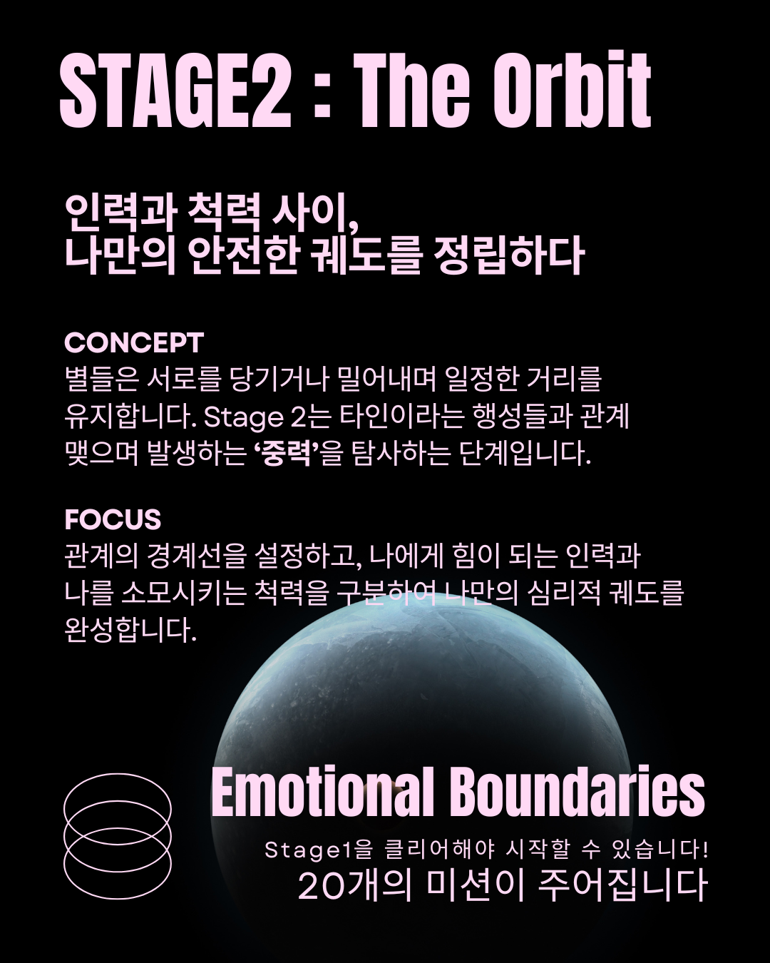 20개의 전체 미션 클리어 시 혜택 : Stage 2 : The Orbit으로 입장할 수 있는 권한이 생깁니다.