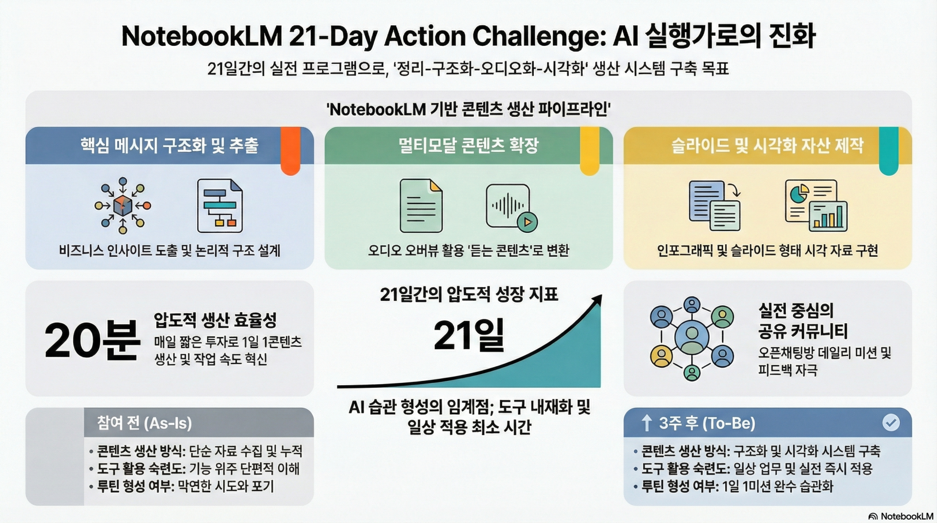 ⭐️ 얻을 수 있는 가치 : NotebookLM을 3주간 매일 실전 적용하며 콘텐츠 정리·오디오화·시각화까지 내 것으로 만드는 습관을 만들 수 있습니다