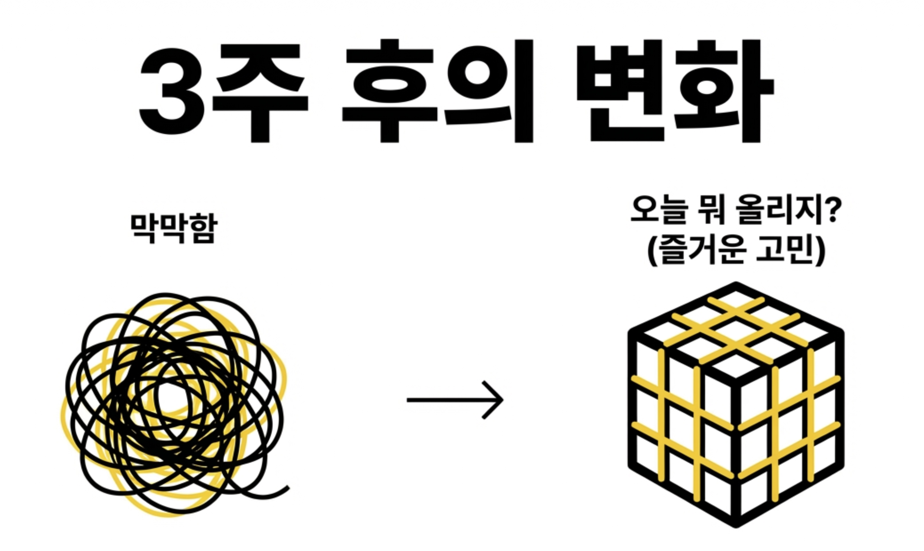 이 과정을 통해 나만의 콘텐츠 생산 시스템을 만듭니다. 3주 뒤, 당신의 작업 속도와 콘텐츠 완성도가 달라질 거예요.